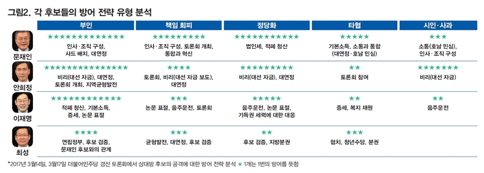 이재명 후보는 기본소득이나 증세 등 정책 문제에는 ‘타협 전략’을 주로 썼고, 음주운전이나 논문 표절 등 후보 개인에 대한 공격은 ‘공격자 공격’ 방식으로 적극적 ‘부인 전략’을 택했다. 최성 후보는 다른 후보들에 견줘 공격받는 횟수가 적었기 때문에 방어 메시지 수 자체도 적었다. 이 때문에 최성 후보는 질문에서 다른 후보를 역공하면서 동시에 자기방어 전략을 주로 폈다.