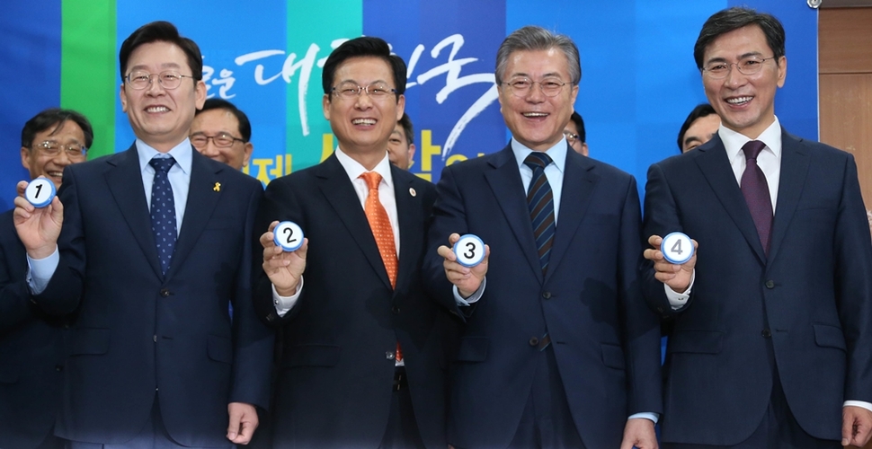 3월14일 더불어민주당 대선 경선 후보인 이재명 성남시장, 최성 고양시장, 문재인 전 대표, 안희정 충남도지사(왼쪽부터)가 경선 기호를 뽑은 뒤 함께 ‘정권 교체’를 외치고 있다. 한겨레 이정우 선임기자