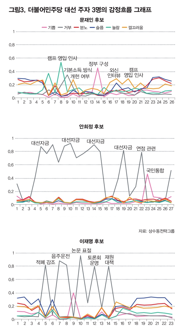 위 그림3에서 나타나듯이, 문재인 후보는 전체적으로 차분한 감정흐름을 보이면서도 캠프 영입 인사 등 인사 문제를 이야기할 때 ‘놀람’ 등 복잡한 감정을 드러냈다. 안희정 후보는 대선 자금 관련 문답 때 ‘거부’ 수치가 급격히 상승하는 등 감정의 진폭이 컸고, 이재명 후보는 음주운전과 논문 표절 등의 이슈 때 감정이 요동친 것으로 나타났다.