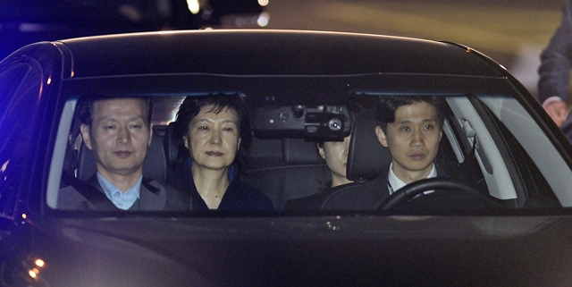 3월31일 서울 서초동 서울중앙지검에서 박근혜 전 대통령을 실은 차량이 서울구치소로 이동하고 있다. 뇌물수수 등 혐의로 구속영장이 발부된 그는 차 안에서 어떤 생각을 했을까. 연합뉴스