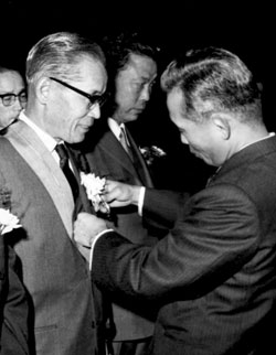 목적을 위해 어떤 수단이든 쓰는 방식을 박근혜는 아버지의 ‘박정희주의’에서 체득한 것 같다. 1969년 박정희 전 대통령이 이병철 삼성그룹 창업주에게 훈장을 달아주는 모습.