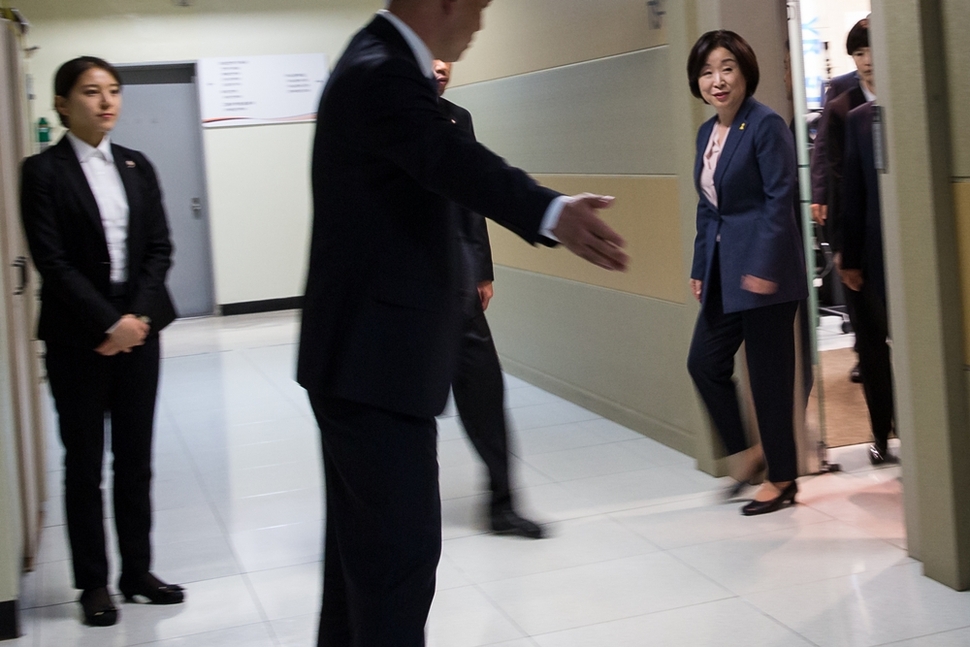 대통령 후보는 경찰 경호를 받는다. 경호원의 안내를 받는 심상정 후보.