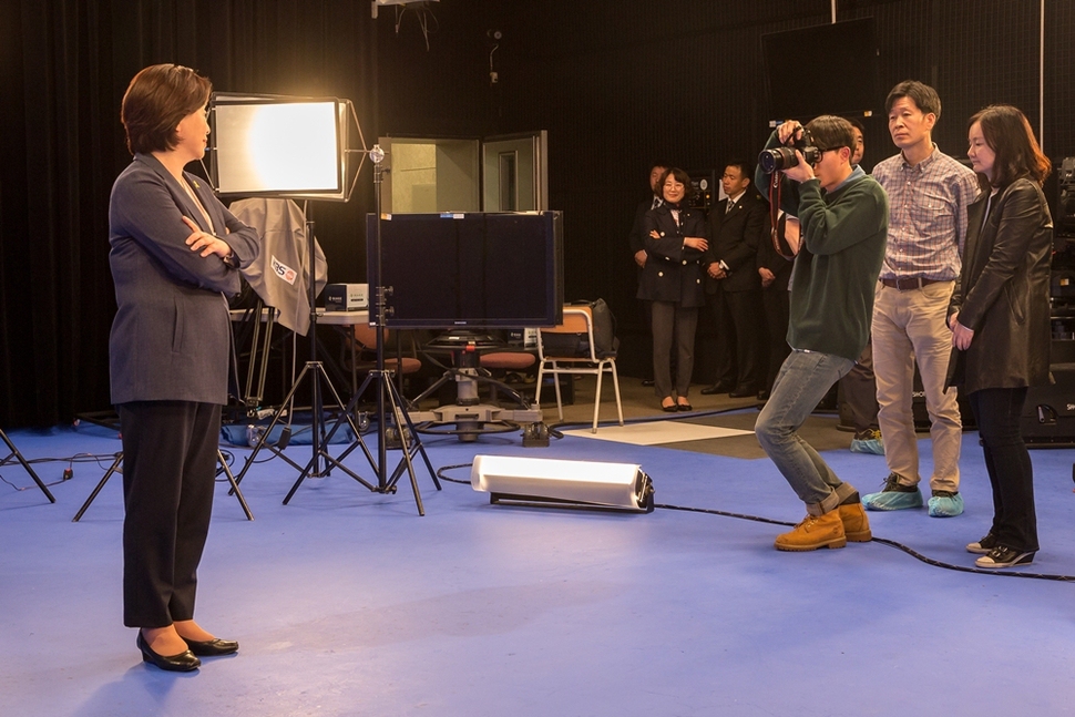 한 방송사의 뉴스 프로그램 출연을 위해 준비하는 후보.