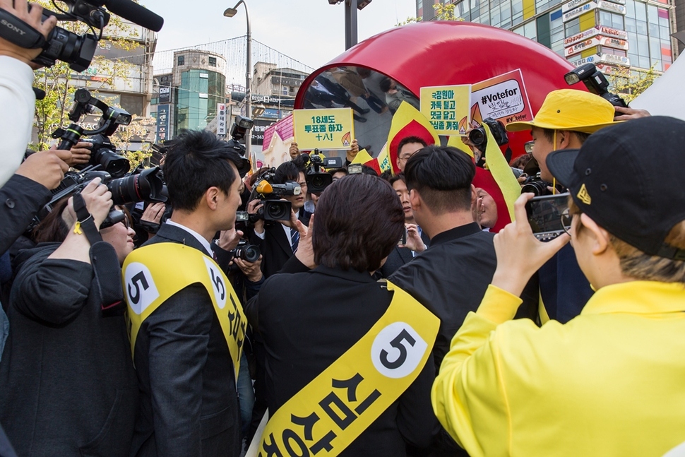 서울 신촌 거리 유세에서 지지자와 취재진에 둘러싸인 심 후보.