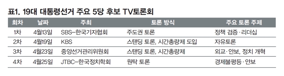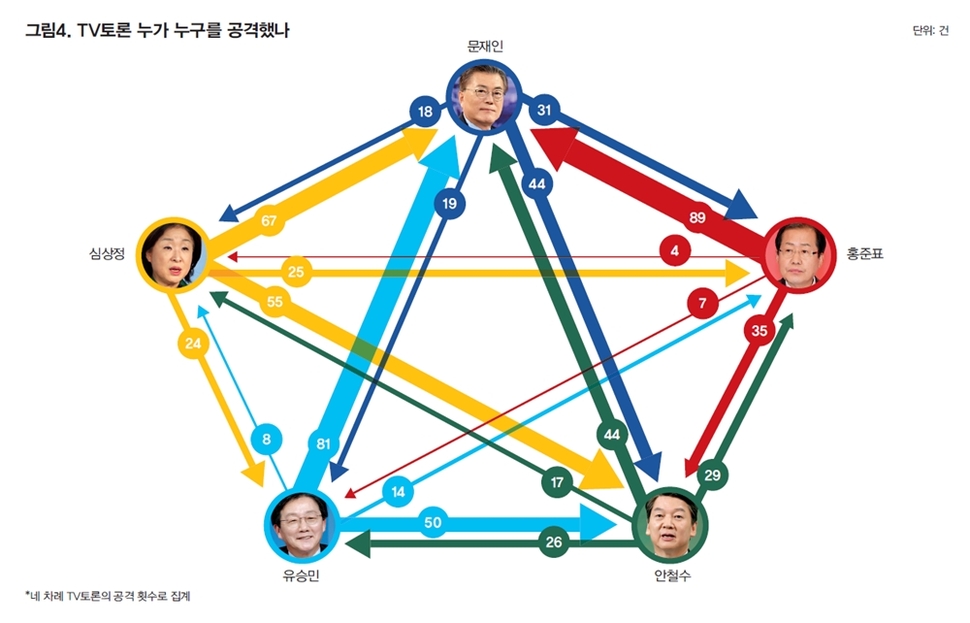 ‘공격-방어’를 위주로 분석한 까닭은 후보자들 간 충돌을 통해 다양한 쟁점이 형성된다고 판단해서다. 물론 충돌이 많았다고 해서 무조건 좋은 토론이었다고 볼 수는 없다. 후보들이 흑색선전이나 주관적 의견 개진을 통해 이미지 차별화 전략에만 주력할 수 있기 때문이다. ‘주적’ ‘세탁기’ ‘갑철수’ ‘강남좌파’ 등 실제 네 차례 토론에서 화제가 된 단어들은 정책 검증보다 흑색선전에 가까웠다.