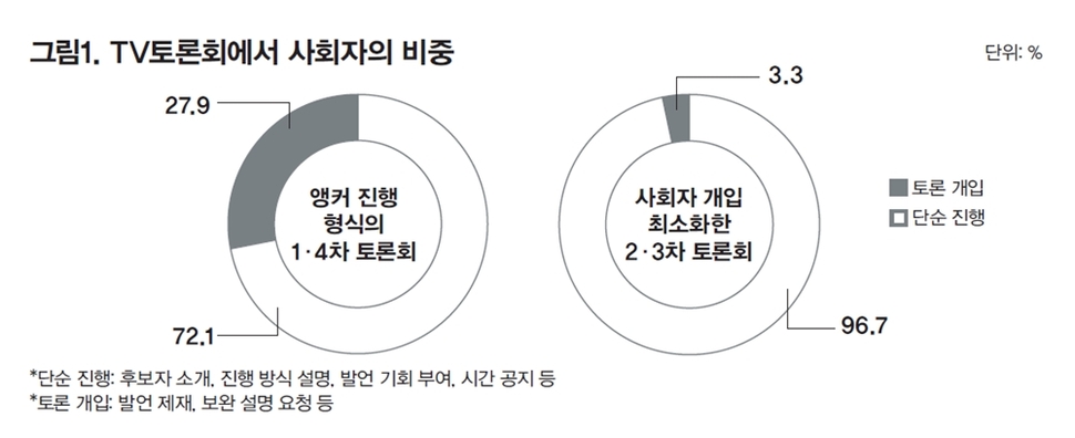 이번 대선 TV토론회는 후보자들이 서서 진행하는 스탠딩 토론, 질문과 발언 시간을 제한하는 시간총량제 등 예전과 다른 진행 방식이 도입됐다. 진행 방식에 따라 ‘사회자가 알람 시계’라는 등 비판 여론도 거셌다. 실제 사회자의 발언 횟수를 따져봤더니, 사회자의 개입을 최소화한 2·3차 토론회와 그렇지 않았던 1·4차 토론회의 차이가 컸다(그림1 참조). 1·4차 토론회에선 사회자가 주제에 어긋난 발언을 하는 후보를 제재하거나 보완 설명을 요청하는 등 ‘토론 개입’이 전체 발언의 27.9%를 차지한 반면, 2·3차 토론회에선 남은 시간을 공지하거나 진행 방식을 설명하는 ‘단순 진행’ 발언이 96.7%에 달했다.
