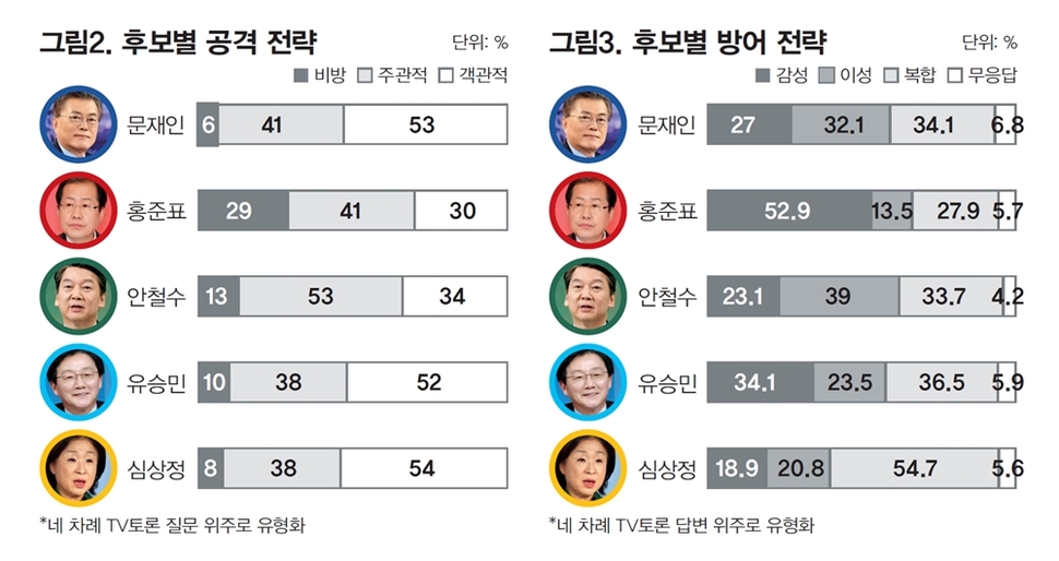 문재인·유승민·심상정, 세 후보는 ‘비방-주관적-객관적’ 공격 분포가 거의 비슷했다. 세 사람 모두 절반 이상의 질문을 객관적 사실을 내세운 공격으로 채웠다. 김은정 선임연구원은 “어떤 질문을 하느냐가 토론의 흐름과 방향을 결정하는데, 근거 없는 비방이나 주관적 해석에 의한 질문은 논의를 실체 없는 말싸움의 틀에 가둬버린다”고 지적했다.