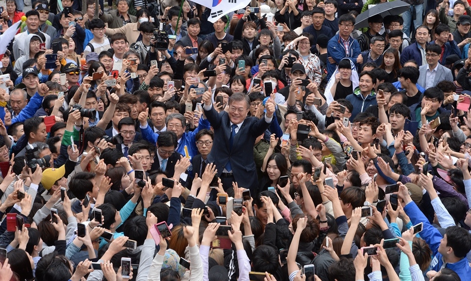 4월18일 오후 문재인 후보가 전주시 전북대 유세에서 손을 들어 지지를 호소하고 있다. 사진공동취재단
