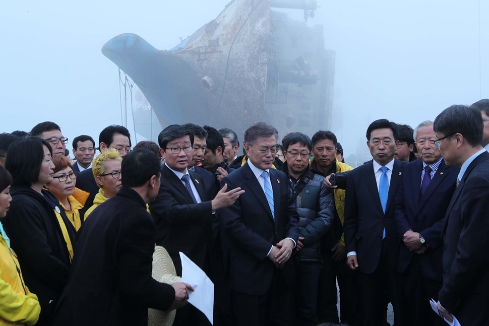 4월6일 반잠수선에 실린 세월호가 접안한 전남 목포신항을 방문한 문재인 후보가 미수습자 가족들과 함께 브리핑을 듣고 있다. 사진공동취재단