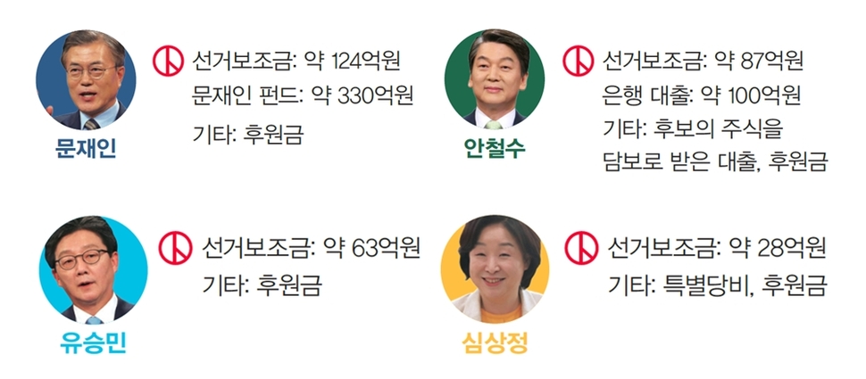 중앙선거관리위원회가 정한 선거 비용 제한액(509억9400만원)에 가까운 돈을 쓰는 대선 캠프는, 문재인 더불어민주당 후보와 안철수 국민의당 후보 캠프다. 선두권 그룹의 ‘자신감’이 깔려 있다. 선거에서 15% 득표율을 넘기면 선관위로부터 선거 비용 전액을 돌려받을 수 있는 덕분이다. 조달 방식엔 큰 차이가 있다. ‘대세론’을 이어온 문 후보 캠프는 유권자를 상대로 모집한 ‘국민주 문재인 펀드’와 선거보조금으로 선거 비용의 90% 이상을 이미 확보한 상태다. 반면 펀드 모집을 하지 않는 안 후보 캠프는 각종 대출로 돈을 마련하고 있다. 그나마 지지율 한 자릿수인 유승민 바른정당 후보와 심상정 정의당 후보는 대출은 엄두도 내지 못한다. 득표율 10~15%이면 선거 비용의 절반을 받지만, 10% 미만이면 한 푼도 보전하지 못하는 탓이다. 이들은 문·안 후보가 잡은 예산의 10~20%로 ‘짠내 나는’ 선거를 치르고 있다.