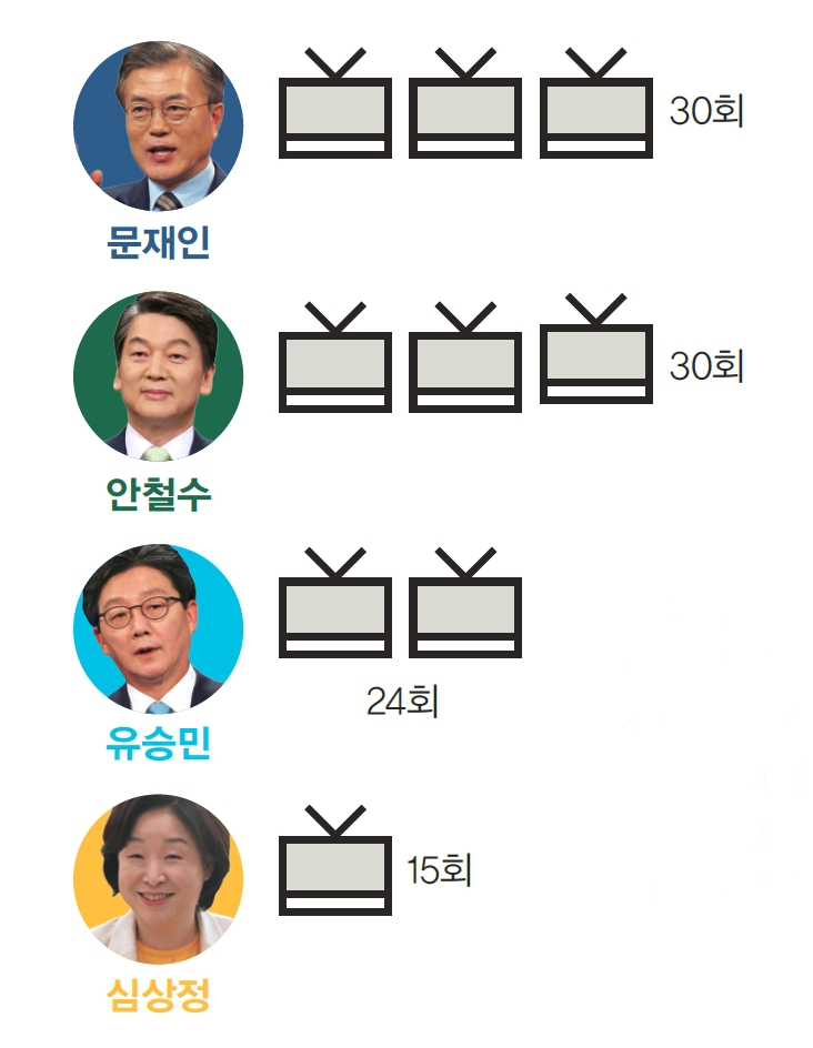 최대치의 실탄을 투입하기로 한 문·안 후보에겐 별다른 ‘전략’이 없다. 선관위가 허용한 광고·유세 방식을 100% 활용하고 있다. 가장 돈이 많이 드는 분야는 방송 연설이다. TV·라디오 방송 연설의 최대치인 44회를 하느라 총 100억~105억원(회당 최고 약 4억4천만원 소요)씩 쓰고 있다. 두 캠프는 회당 1천만~3천만원이 드는 방송 CF 광고도 상한선인 30회를 신청했다. 한 푼이 아쉬운 유·심 후보는 방송 연설은 엄두를 내지 못하고, 방송 CF 광고도 50~80%만 내보내고 있다.