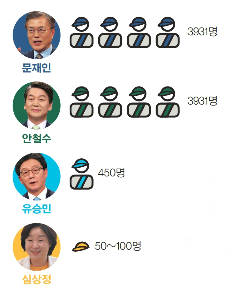 문·안 후보는 ‘유세전’에도 물량 공세를 퍼붓고 있다. 각 캠프의 유세 차량 300대(최대치는 340대)가 전국을 누비고 있다. 유세 차량 한 대에 드는 돈은, 가장 작은 1t 차량 기준으로 2천만~3천만원에 이른다. 두 캠프는 하루에 7만원씩 지급해야 하는 유급 선거사무원도 법정 한도인 3931명씩 두고 있다. 반면 유·심 후보는 유세 차량을 시·도당 1대씩만 운행하며, 선거사무원도 수십∼수백 명에 불과하다. 유권자 집으로 배달되는 책자형 선거공보물에서도 ‘빈부 격차’는 나타난다. 문·안 후보는 최대치인 16면을, 유·심 후보는 절반인 8면을 만들었다. 역시 돈 때문이다. 공보물 한 권을 제작·배포하는 데도 20억원 이상이 필요하다.