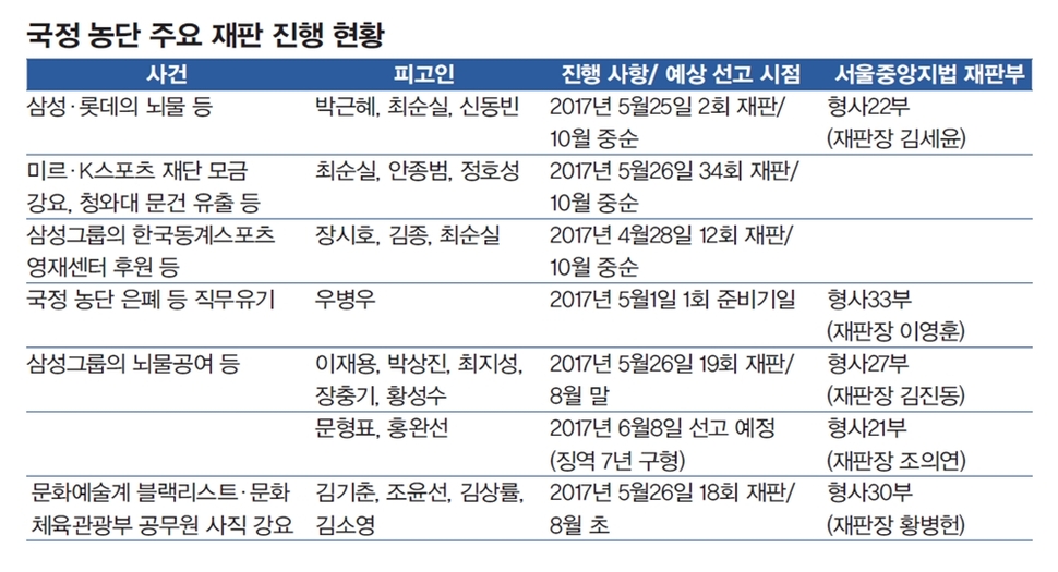 실제 특별검사팀은 앞서 최씨의 ‘뇌물’ 재판에서 박 전 대통령의 의상비 및 진료비 대납, 차명폰 통화 내역, 주택 대리 구입 등을 근거로 두 사람이 공사 영역에서 밀접한 관계에 있다고 주장해왔다. 최씨 ‘뇌물’ 재판에선 조카 장시호씨가 나와 “이모가 박 전 대통령이 해외 순방 중 받은 선물은 물론, 박 전 대통령 삼성동 사저에 있던 가구까지 제공했다”고 증언했다. 박 전 대통령이 성형 시술을 받은 차움의원의 간호사도 최씨가 매번 박 전 대통령의 진료비를 결제했다는 취지로 진술했다. 박 전 대통령과 최씨가 가족과 마찬가지임을 보여주는 증언은 박 전 대통령 재판에서 증거로 활용될 가능성이 있다. 다만 두 사람이 운명 공동체임이 입증되더라도, 최씨가 받은 돈이 모두 뇌물인 건 아니다. 직무 관련 금품이어야 하고, 대가성이 있어야 한다. 판례는 대통령의 직무 범위를 다른 공무원에 비해 폭넓게 인정한다. 대법원은 1997년 전두환·노태우 전 대통령의 뇌물수수 사건에서 “뇌물은 대통령의 직무에 관해 공여되거나 수수된 것으로 족하고 개개의 직무 행위와 대가적 관계에 있을 필요가 없다”고 했다. 대통령은 모든 국정 영역을 관장한다는 점을 고려한 판단이다. ‘결정적 한방’을 만드는 무수한 ‘잽’ 단순 뇌물보다 입증이 더 까다로운 뇌물도 있다. 전체 592억원 가운데 삼성이 최순실씨의 딸 정유라씨의 말 구입 등을 위해 직접 최씨 회사에 제공한 뇌물 213억원을 뺀 379억원이다. 이는 박 전 대통령이 삼성·롯데·SK로부터 재단 출연금이나 영재센터 후원금 명목으로 받거나 받기로 한 돈이다. ‘379억원 뇌물’엔 제3자 뇌물수수 혐의가 적용됐는데, 이 혐의가 인정되려면 직무관련성에 더해 ‘부정한 청탁’이 있었다는 것도 입증돼야 한다. 우리 법원은 ‘부정한 청탁’의 범위를 폭넓게 인정하는 편이다. 대가관계 합의에 대해 묵시적 청탁만 있어도 충분하단 것이다. 대법원은 최근 정옥근 전 해군참모총장이 아들 요트회사를 통해 STX조선해양으로부터 뇌물을 받은 사건에서, ‘묵시적 인식과 양해도 부정한 청탁’이란 취지로 판결했다. 이에 따라 박 전 대통령이 기업 총수들과 두세 차례 거친 독대에서 경영권 승계(삼성), 면세점 특허(롯데) 등에 대한 묵시적 청탁이 있었는지가 핵심 쟁점이 될 것으로 보인다. 박 전 대통령 사건과 ‘동전의 양면’ 같은 이재용 삼성전자 부회장 사건도 쟁점은 엇비슷하다. 먼저 박 전 대통령이 이 부회장과 세 차례 단독 면담하면서 부정한 청탁을 주고받거나 대가관계를 합의했는지가 관건이다. 특검팀은 박 전 대통령이 독대 자리에서 최씨 딸 정유라씨에 대한 승마 지원 등을 요구했고, 이 부회장은 그 대가로 금융지주회사 전환 승인 등 기업 현안을 해결해달라고 요청했다고 판단한다. 물론 이 부회장은 어떠한 청탁도 하지 않았단 입장이다. 이 부회장 쪽이 “특검 공소장에 추측과 논리적 비약이 가능하다”고 하거나 박 전 대통령 쪽이 “추론과 상상에 의한 기소”라며 자신감을 보이는 것은 실제 두 사람을 빼곤 ‘부정한 청탁’의 목격자가 없기 때문이다. 결국 특검은 독대 전후 상황을 바탕으로 퍼즐을 맞출 수밖에 없다. 독대 전 준비된 ‘대통령 말씀자료’와 독대 후 대통령 지시 사항을 기록한 안종범 전 청와대 정책조정수석의 ‘업무수첩’을 바탕을 독대 상황을 재구성했다. ‘결정적 한방’은 없지만 무수한 ‘잽’을 모아보면 퍼즐이 완성된다. 지난 5월24일 법정에서 공개된 공정위 작성의 ‘청와대 외압 일지’를 보면, 공정거래위원회는 2015년 7월 삼성물산과 제일모직 합병 뒤 삼성이 삼성물산 주식 1천만 주를 처분해야 한다고 결정했지만, 삼성과 청와대의 ‘쌍끌이 압력’으로 2개월 만에 기존 결정을 뒤집고 처분 주식을 500만 주로 줄여준 것으로 조사됐다. 삼성의 자문을 맡은 공정위 부위원장 출신 전관까지 공정위에 청탁해온 것으로 드러났다. 지난해 서울고법은 옛 삼성물산 주주인 일성신약이 삼성물산을 상대로 낸 소송에서 “옛 삼성물산의 실적 부진이 이건희 등의 이익을 위하여 누군가에 의해 의도되었을 수도 있다는 의심에는 합리적인 이유가 있다”고 지적했다. 독대 전후 여건이 ‘경영권 승계’에 우호적으로 돌아가는 게 우연의 일치로 보기에 석연치 않단 얘기다. 6월8일 예정된 문형표 전 보건복지부 장관 선고에도 눈길이 모인다. 문 전 장관은 재직 시절 박 전 대통령의 지시를 전달받고 복지부 산하 국민연금공단이 삼성 합병에 찬성하도록 압력을 행사한 혐의를 받고 있다. 박 전 대통령 개입 여부에 대한 판단이 문 전 장관 판결문에 담길 수도 있다. 다만 검찰이 박 전 대통령과 최순실씨 재판에서 넘어야 할 산은 이른바 ‘이중 기소’ 문제다. 삼성의 433억원 뇌물엔 직권남용, 강요와 뇌물 죄명이 동시에 적용됐다. 같은 돈을 두고 삼성은 피해자이자 공범이 된 것이다. 삼성과 박 전 대통령 쪽이 ‘약한 고리’로 꼽는 부분이기도 하다. 반면 검찰은 두 혐의가 동시에 성립한다는 입장이다. 공무원이 먼저 금품을 요구하는 ‘요구형’ 뇌물의 경우, 뇌물 요구 과정에서 강요 성격이 있단 판단이다. 실