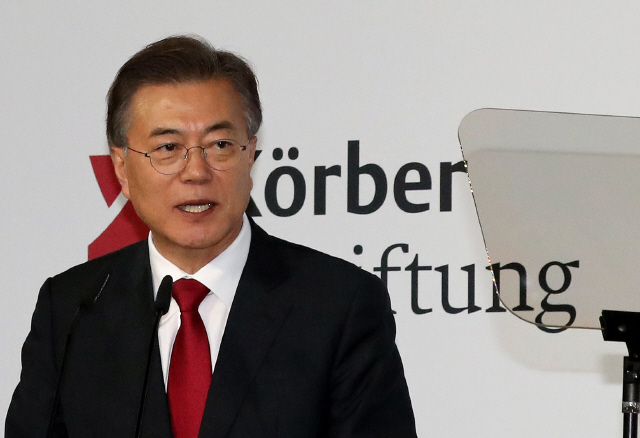 문 대통령은 7월6일 옛 베를린 시청에서 한 초청 연설에서 “완벽하고 검증 가능하며 불가역적인 한반도 비핵화는 국제사회의 일치적인 요구이자 한반도 평화를 위한 절대 조건”이라며 “군사적 긴장의 악순환이 한계점에 이른 지금 대화의 필요성이 과거 어느 때보다 절실해졌다”고 말했다. 그리고 “우리가 추구하는 것은 오직 평화다. 평화로운 한반도는 핵과 전쟁의 위협이 없는 한반도, 남과 북이 서로를 인정하고 존중하며 함께 잘사는 한반도다. 우리는 북한의 붕괴를 바라지 않으며 어떤 형태의 흡수통일이나 인위적인 통일도 추구하지 않을 것이다”라고 선언했다. 문 대통령은 평화구상 실현을 위해 △평화 최우선 △북한 체제 안전을 보장하는 비핵화 △한반도 평화협정 체결 등 항구적 평화체제 구축 △한반도 경제 공동체 건설 △비정치적 민간 교류 협력 등 5대 대북정책 기조를 제시했다.