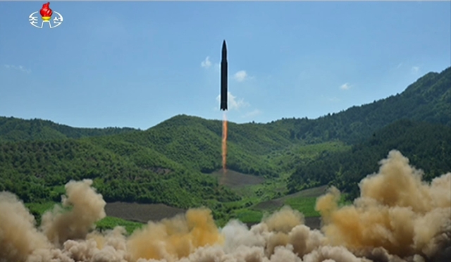 북한은 7월4일 대륙간탄도미사일(ICBM) ‘화성-14’형 시험발사에 성공했다고 발표했다. 조선중앙텔레비전 연합뉴스
