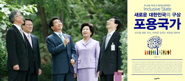 노무현 대통령 부부가 2007년 10월 남북 정상회담을 앞두고 문재인 당시 비서실장(맨 왼쪽), 백종천 외교안보실장(왼쪽 두 번째), 성경륭 정책실장(맨 오른쪽)과 청와대 녹지원에서 이야기하고 있다. 성경륭 교수가 문재인 대통령의 정책자문 교수들과 함께 최근에 펴낸 정책제안집 <새로운 대한민국의 구상 포용국가>. 청와대사진기자단