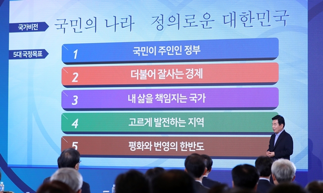 김진표 국정기획자문위원장이 7월19일 청와대 영빈관에서 열린 국정과제 보고대회에서 ‘국정운영 5개년 계획’을 발표하고 있다. 연합뉴스