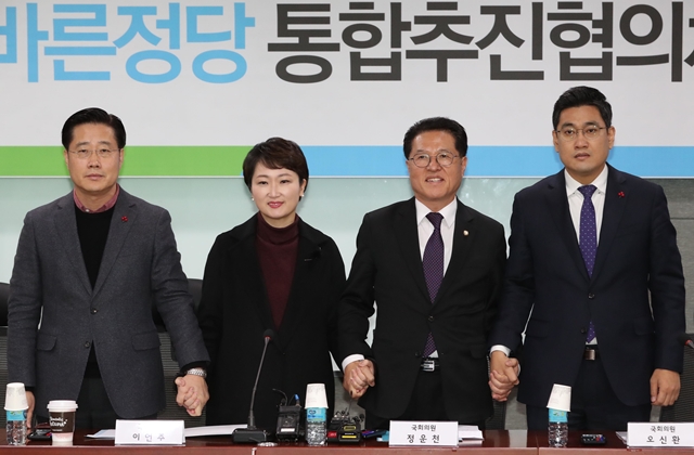 국민의당과 바른정당의 통합추진협의체가 출범한 1월 3일 오전 국회 의원회관에서 양당 협상 대표들이 두손을 맞잡고 있다. 왼쪽부터 국민의당 이태규·이언주의원, 바른정당 정운천·오신환 의원. 한겨레 이정우 선임기자