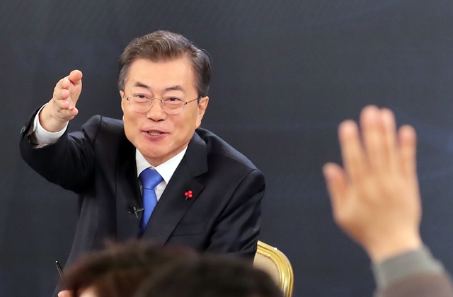 1월10일 문재인 대통령이 청와대 영빈관에서 열린 새해 기자회견에서 질문자를 지명하고 있다. 이날 문 대통령은 기본권·지방분권을 확대하는 방향의 개헌 필요성을 강조했다. 연합뉴스