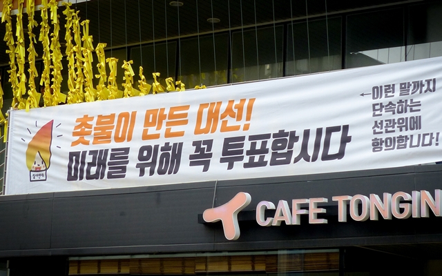 참여연대가 2017년 4월 대선을 앞두고 ‘촛불’이라는 단어를 현수막에 쓰지 못하게 제재한 중앙선거관리위원회에 항의하기 위해 서울 종로구 통인동 사무실 앞에 게시한 현수막. 참여연대 제공