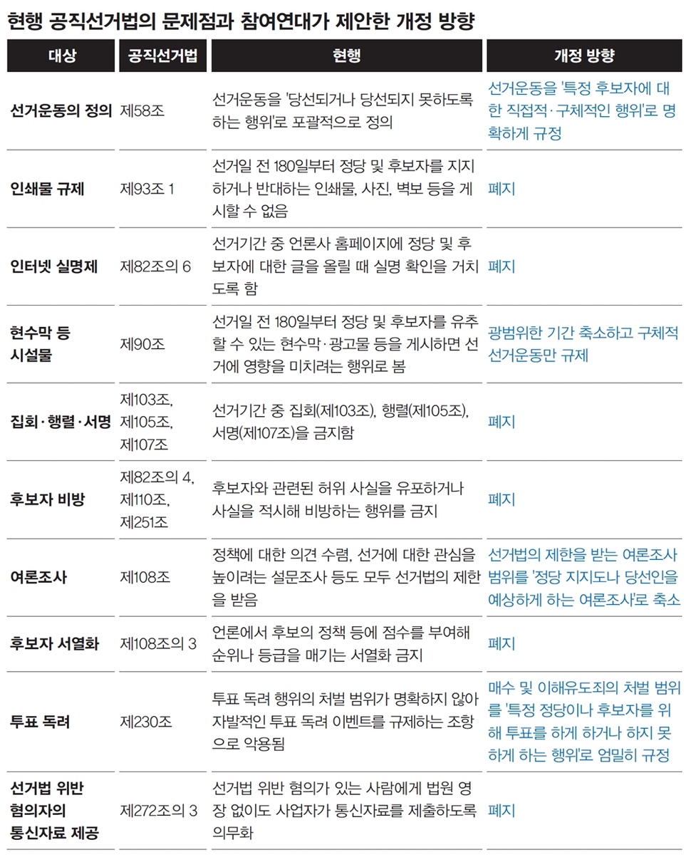 SNS ‘좋아요’나 공유하기로도 기소 정답은 ‘모두 다’이다. 정말일까? 믿기 힘들겠지만, 그렇다. 선거법 위반으로 중앙선거관리위원회와 경찰로부터 제재당하거나 기소까지 이뤄진 사례들이다. 시민들의 일상적인 정치적 의사표현은 선거 기간만 되면 때때로 ‘불법 선거운동’으로 낙인찍혀 처벌 대상이 된다. 유권자의 자유로운 정치적 의사표현을 가로막는 현행 선거법의 여러 ‘독소조항’들 때문이다. 참여연대 의정감시센터는 4월16일 현행 선거법의 과도한 규제 조항으로 2010년 이후 유권자가 실제 피해를 당한 사례 33건을 유형별로 분석한 ‘온통 하지마’ 선거법 유권자 피해 사례 보고서(이하 보고서)를 발표했다. <한겨레21>은 6·13 지방선거를 앞두고 이 보고서를 미리 입수해 분석해봤다. 현행 선거법의 가장 큰 문제는, 선거 기간에 이뤄지는 대부분의 정치적 의사표현을 ‘선거운동’으로 낙인찍을 수 있다는 점이다. 현행법이 선거운동을 “(특정 후보자가) 당선되거나 되게 하거나 되지 못하게 하기 위한 행위”(제58조)라는 식으로 지나치게 포괄적으로 정의하고 있기 때문이다. 또 선거가 이뤄지는 날부터 180일 이전에 이뤄지는 선거운동에 법상 여러 까다로운 제약이 부과된다. 즉, 선거를 앞둔 시점에선 특정인의 당선이나 낙선에 영향을 끼치는 시민들의 정치적 의사표현이 선거운동으로 분류될 수 있으며, 그럴 경우 애먼 시민들이 선거법 위반 사범으로 처벌될 가능성이 높아지는 셈이다. 참여연대는 보고서에서 실제 유권자들이 피해를 당한 총 33개 사건을 △투표 독려 행위(4건) △소셜네트워크서비스(SNS)로 후보에 대한 단순한 의견 개진(4건) △주요 이슈에 대한 후보의 입장 질의·공약 비교 평가(8건) △후보에 대한 풍자·의혹 제기(5건) △후보와 정책에 대한 찬반 의견, 낙천·낙선 운동(12건) 등 5가지로 분류했다. 보고서가 제시한 5가지 선거법 위반 사례를 하나씩 살펴보며, 현행 선거법의 문제를 짚어보자. 가장 황당한 사례는, SNS를 통한 시민의 자유로운 의사표현을 선거운동으로 분류해 단속한 것이다. 심지어 다른 사람의 SNS 게시글에 ‘좋아요’를 누르거나 공유했다는 이유로 검찰에 기소된 이도 있다. 국립 초등학교 교사 박동국씨는 20대 총선을 이틀 앞둔 2016년 4월11일 자신의 페이스북에 “새누리당의 총선 공약에 교육감 직선제 폐지가 있는 거 알고 계시나요? 국회선진화법도 고쳐 다수결로 밀어붙이겠다고 합니다. 20대 총선의 결과가 새누리당의 압승으로 끝나고 나면 다수의 힘으로 밀어붙여 진보교육감의 싹을 자르고 혁신학교, 혁신교육지구, 전교조 죽이기 등이 본격화할 것입니다. 야권 분열로 국가의 미래가 절단 나게 생겼습니다”라는 글을 올렸다. 교육감 직선제와 국회선진화법에 대해 자신의 의견을 밝히고, 이를 특정 정당의 공약과 연결한 글이었다. 검찰은 이 글이 ‘선거법상 선거운동’이기에 공무원 신분의 박씨가 이런 글을 올린 것은 선거법 위반(‘공무원은 선거운동을 할 수 없다’는 법 제60조 위반)이라며 기소했다. 이후 서울북부지방법원은 2016년 12월23일 검찰의 기소 내용을 받아들여 벌금 50만원을 선고했다. “평소 행동 선거 180일 이내면 위법” 현재 항소심을 진행 중인 박씨는 자신이 올린 의견 표명 글이 ‘선거운동에 해당한다’는 1심 판결에 황당함을 감추지 못했다. 이후 박씨는 SNS에 정치 관련 글 쓰기를 포기하고 있다. 그는 “항소심에서도 유죄판결이 나오면 전국 공무원들은 자신의 정치적 신념을 외부로 드러내길 꺼릴 것이다. 이는 한국의 정치 발전에 도움이 안 되는 일”이라고 말했다. 선거운동 기간에 유권자의 입을 틀어막는 데 가장 큰 구실을 하는 선거법 조항은 제90조(시설물 설치 등의 금지)와 제93조(탈법 방법에 의한 문서·도화의 배부·게시 등 금지) 등이다. 이 조항은 선거일 180일 전부터 “선거에 영향을 미치게 하기 위하여” 정당의 명칭이나 후보자의 성명·사진 등을 화환·풍선·간판·현수막·표찰 등에 게시하지 못하게 하거나(제90조), 광고·벽보·사진·문서·인쇄물·녹화테이프 등으로 만들어 배포할 수 없게 하는(제93조) 조항이다. 그러나 이렇게 꼼꼼한 조항들로 인해 시민들의 자유로운 의사표현이 가로막힌다. 제19대 대선을 한 달 앞둔 2017년 4월15일. 청소년인권 운동모임인 ‘인권친화적 학교+너머 운동본부’(이하 운동본부) 활동가들이 광화문광장에 모여 ‘청소년인권 시험 치른 대선 후보들’이라는 제목의 유인물을 배포하려 했다. 그러나 이들의 활동은 선관위에 제지당했다. 유인물에 운동본부가 각 대선캠프에 교육과 청소년인권에 대해 질문을 던진 뒤 돌아온 답을 비교하는 내용이 담겼기 때문이다. 선거의 자유를 강조하는 방향으로