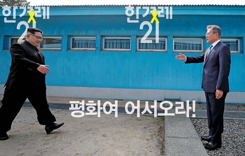 4월27일 김정은 국무위원장은 성큼성큼 걸어와 문재인 대통령의 내민 손을 맞잡았습니다. 두 손의 온기가 고스란히 담긴 ‘판문점 선언’은 그렇게 탄생했습니다. 반세기를 훌쩍 넘긴 전쟁을 종식하고, 평화체제로 나아가겠다는 두 정상의 약속이 그 안에 숨쉬고 있습니다.
