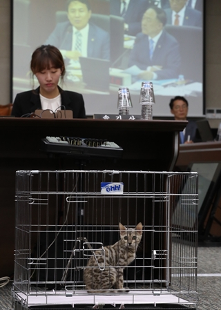 김진태 자유한국당 의원이 10월10일 국회 정무위원회 국정감사장에 데려온 벵골 고양이. 연합뉴스