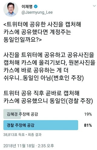 그동안 각종 의혹에 “사실이 아니다”라며 대응해온 이 지사가 벼랑 끝에 몰리자 “경찰은 진실보다는 권력을 선택했다”(11월19일 경기도청 출근길 기자회견)고 경찰 수사 ‘배후’ 의혹을 제기한 것은 결국 ‘친문 진영’에서 자신을 공격한다는 의심에 기반을 둔 것으로 풀이된다. 여의도 정치 이슈로 선회하는 데 도움돼 이 지사 쪽이 검찰에 제출한 변호인 의견서에 “문 대통령 아들 준용씨가 언급됐다”는 보도가 나오자, 이 지사는 이를 해명하는 소셜네트워크서비스(SNS) 글에서 “문준용씨 특혜 채용 의혹은 ‘허위’라고 확신한다”면서 다음과 같이 언급했다. “아내를 고발한 측에서 혜경궁 김씨 트위터 계정에서 특혜 채용 의혹 글을 썼고, 이게 죄(허위 사실에 의한 명예훼손)가 된다고 주장한다. 그 글이 죄가 되지 않는다는 것도 법적으로 입증해야만 한다. 먼저 특혜 채용 의혹이 ‘허위’임을 법적으로 확인한 뒤 이를 바탕으로 ‘허위 사실에 대한 명예훼손’ 여부를 가릴 수밖에 없다.” 물론 김용 경기도청 대변인은 “고발장(범죄일람표)에 39건의 트위터 게시물이 적시됐는데, 대다수가 문준용씨 관련 내용이다. 문씨를 수면 위로 올린 것은 바로 이 고발장”이라며 확대해석하지 말라고 선을 그었다. ‘경찰 배후’ 발언도 김 대변인은 “검찰의 공정한 수사 결과로 진실이 밝혀지기를 바라는 표현”이라며 배후의 실체를 특정하지는 않았다. 하지만 이 지사는 “사건의 본질은 이간계”라며 “우리는 문재인 정부 성공, 민주당 정권 재창출이라는 역사적 책임을 다해야 하고 차이를 넘어 단결해야 한다”고 ‘배후론’의 여지를 남겼다. 이 지사의 대응은 의도했든 안 했든 ‘혜경궁 김씨 계정 주인이 누구냐’는 문제를 여의도 정치 이슈로 시선을 돌리는 데 일정 부분 성과를 냈다. 야당과 언론은 ‘친문 vs 비문’이라는 민주당의 낡은 갈등 구도를 수면 위로 올리고, 차기 대선 주자를 둘러싼 여권 내 권력투쟁으로 해석했다. 당 밖의 열성 지지그룹과 이 지사의 갈등으로 바라보며 관련 논란에 선을 그어왔던 민주당 입장에선 당혹스러울 수밖에 없었다. 민주당의 한 관계자는 “이 지사는 정치적 아이큐가 뛰어난 사람이다. 문준용씨 이야기를 그냥 꺼내지는 않았을 것이다. 실체와 상관없이 너무 나갔다”고 말했다. 결국 이 지사는 권력에 핍박받는 ‘비주류 이재명’이란 프레임을 짜려 한다는 것이다. 꼬리를 잡아 몸통 흔드는 싸움의 기술 이는 변호사로 출발해 성남시장-경기도지사-여권의 차기 주자까지 올라온 이 지사의 ‘전략’과 맞닿아 있다. 그는 여러 차례 “‘꼬리를 잡아 몸통을 흔든다’는 말을 좋아한다”고 언론 인터뷰에서 밝혔다. 자신의 책 <오직 민주주의, 꼬리를 잡아 몸통을 흔들다>(리북·2014)에서 그는 이 말에 관한 자기 생각을 밝혔다. “꼬리가 몸통을 흔든다는 말이 있다. 흔히 현물거래에서 파생된 꼬리인 선물거래가 시장 영향력이 커지면서 오히려 몸통인 현물시장을 좌우하는 위력을 발휘하는, 주객이 전도된 상황을 가리킨다. 그러나 이것은 몸통이 정상이고, 꼬리가 비정상일 때의 이야기이다. 몸통이 비정상이라면? 그래서 몸통을 바로잡아야 한다면?” 여기서 이 지사가 규정하는 ‘몸통’은 기득권과 보수 진영이다. “꼬리를 잡아 몸통을 흔든다”는 결국 이 지사의 정치철학이자 ‘싸움의 기술’이다. 민주당 내부에 변변한 지지 기반이 없고 인지도도 떨어지는 그는 성남시에서 새누리당(자유한국당), 국가정보원 등의 권력기관에 끊임없이 싸움을 걸며 ‘몸집’을 불려왔다. 직설과 막말의 경계를 넘나드는 ‘SNS 정치’로 일반 대중과 소통하며 ‘비주류 정치인 이재명 vs 기득권 세력’ 구도를 끊임없이 만들었다. 자신은 버니 샌더스 미국 상원의원으로 비유되고 싶어 하지만, 도널드 트럼프 미국 대통령과 계속 비교되는 이유다. 2014년 6·4 지방선거 당시 ‘형수 욕설 녹취’가 논란이 되자 “국정원이 자신을 사찰했다”고 기자회견을 하고 소송을 이어간 것은 대표적인 예다. 그는 자신의 책에 당시를 복기하며 “일련의 사건들을 겪으면서 나는 아주 소중한 깨달음을 얻었다. 해방 이후 오늘날까지 고질병처럼 이어져온 정치 공작이야말로 시급하게 사라져야 할 구태 정치라는 사실” “그들의 공격이 거셀수록 나 역시 그만큼 강하고 두려운 상대라는 사실이 증명되는 셈이다”(<이재명은 합니다> 위즈덤하우스·2017)라고 썼다. 이러한 그의 전략을 15살 ‘소년공’으로 불우한 유년기를 보내며 자신만 믿고 지금까지 달려온 그의 삶과 연관해 설명하는 이들도 있다. 이 지사를 오랫동안 지켜본 정치권 한 인사는 “지금의 대응은 힘들게 살아온 삶의 궤적이 반영된 것이다. 어디에도 의지하지 못하고 자신의 힘으로 돌파해온 유년 시절 때문에 위기가 닥쳐오면 방어적 태세가 된다. 지금의 대응은 공격이 아니라 수비”라고 말했다. 박성민 ‘정치컨설팅 그룹 민’ 대표는 “이 지사 개인의 스타일이 강하게 드러나고 있다. ‘맞서 싸우지 않으면 죽는다. 가진 게 없고 주류가 아니면 더 밟는다’는 인식이다. (드루킹 사건에 연루된) 김경수 경