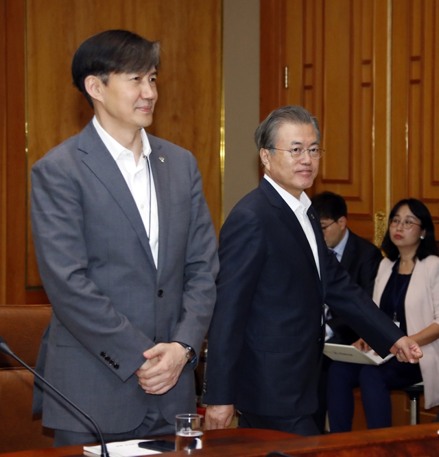 조국 청와대 민정수석이 6월20일 청와대에서 열린 제4차 반부패정책협의회 회의장에 들어오는 문재인 대통령을 맞이하기 위해 자리에서 일어나고 있다. 연합뉴스