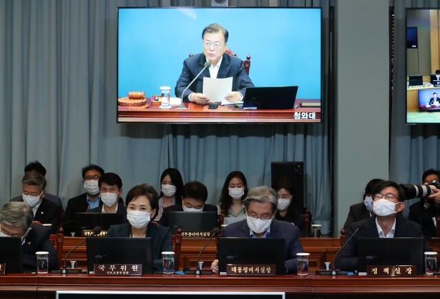 노영민 대통령비서실장(왼쪽 셋째)과 김현미 국토교통부 장관(왼쪽 둘째)이 7월7일 국무회의에서 문재인 대통령의 발언을 듣고 있다. 이들은 야당으로부터 부동산 대책에 대한 국민 불신을 자초한다는 비판을 받고 있다. 연합뉴스