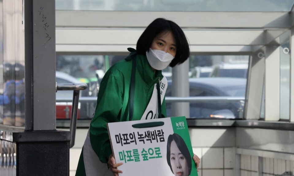 6·1 지방선거 서울 마포구의원에 출마한 이숲 녹색당 예비후보가 2022년 5월10일 대흥역 들머리에서 출근길 주민을 상대로 지지를 호소하고 있다. 류우종 기자