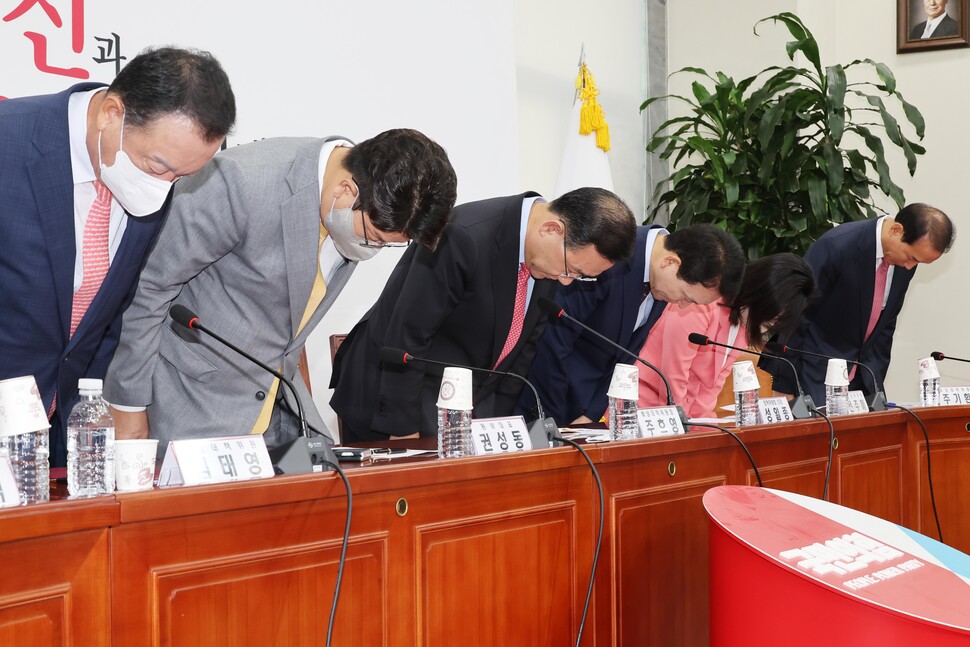 주호영 국민의힘 비상대책위원장(왼쪽 셋째) 등이 2022년 8월18일 국민에게 사죄의 인사를 하고 있다. 공동취재사진