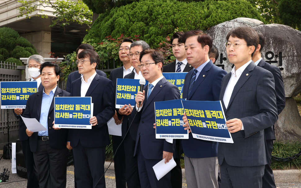 더불어민주당 윤석열정권정치탄압대책위원회 박범계 위원장과 소속 국회의원들이 2022년 9월26일 오전 감사원 앞에서 문재인 정부에 대한 표적감사 중단을 촉구하고 있다. 공동취재사진