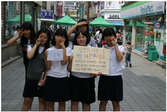 지난해 6월, 소보미(오른쪽 두번째)양이 이천 YMCA 청소년 회원들과 함께 경기도 이천시 중리동에서 피켓을 들고 공정무역을 알리고 있다.
