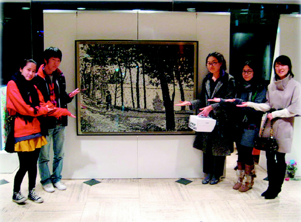 AOA 회원인 한국화 아티스트 김소리양의 전시회 모습. 왼쪽부터 우예림씨의 여동생인 우예진, 김규철, 문소원, 김수민, 김소리. AOA 제공