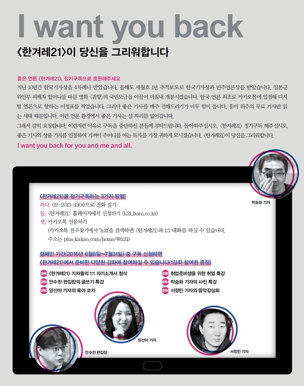 그래서 감히 요청합니다. 이런저런 이유로 구독을 중단하신 분들께 부탁드립니다. 돌아와주십시오. <한겨레21> 정기구독 해주십시오.