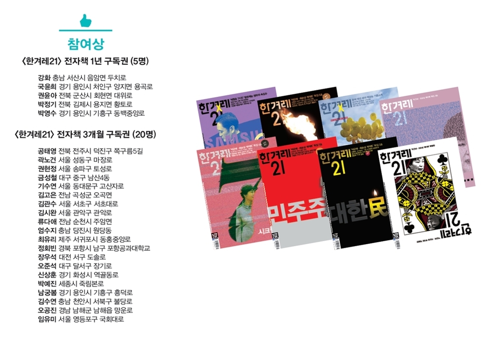 ※ 애플 앱스토어에서 <한겨레21> 앱 심사 기간이 예상보다 길어진 탓에 설 퀴즈큰잔치 응모 기간을 일주일 늘렸습니다. 결과 발표도 한 주 늦추게 되었습니다. 첫 공지보다 결과 발표가 늦어진 점 사과드립니다.