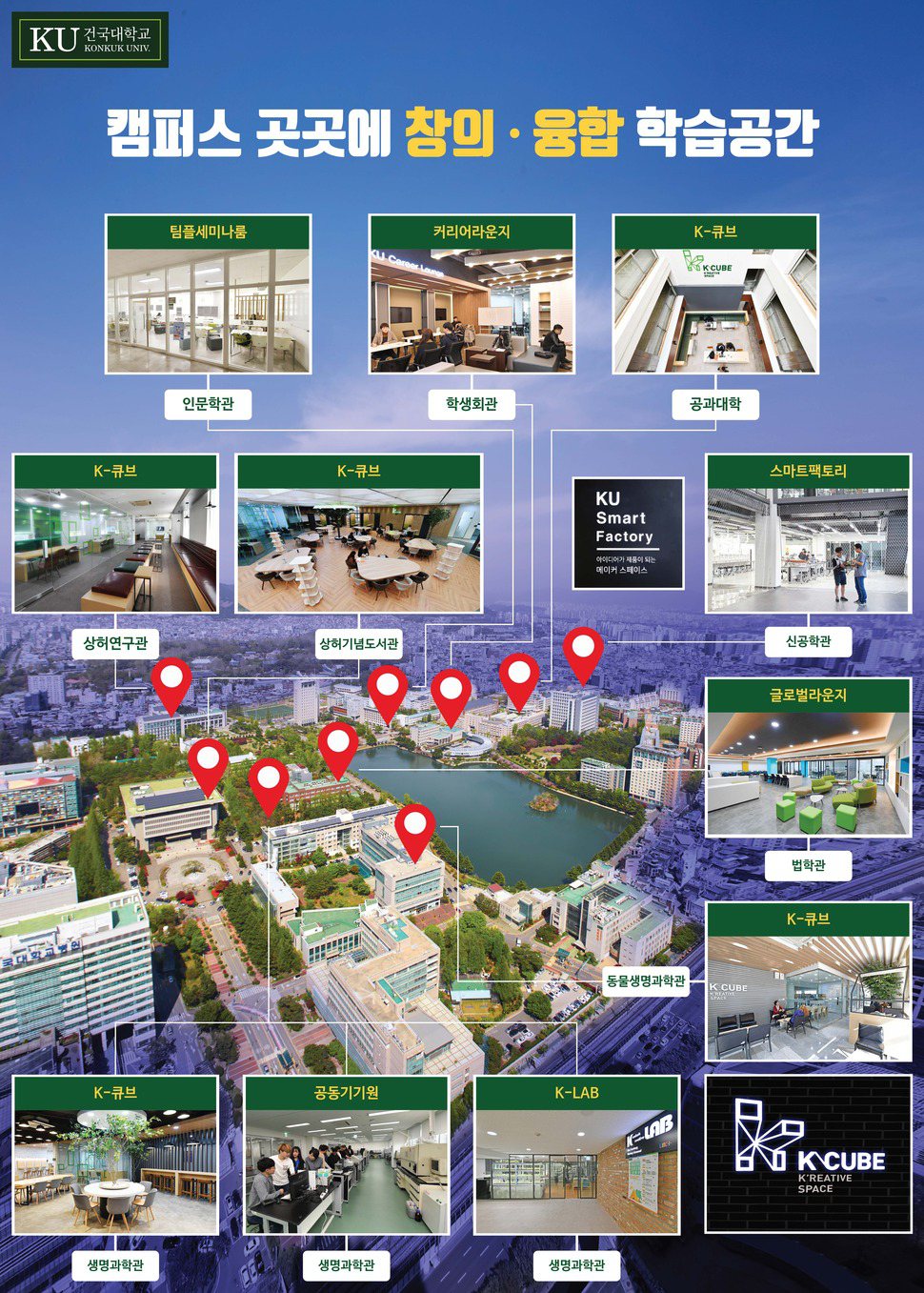 건국대 캠퍼스에는 학생들이 함께 토론하고 교류하며 창의성을 높이고 자신의 아이디어로 제품을 만들 수 있는 창의· 융합형 교육 시설이 곳곳에 들어섰다. 특히 지난해 하반기부터 첨단 개방형 창의·융합학습 라운지인 ‘K-큐브’를 캠퍼스내 5개 건물에 오픈해 팀 기반 개방형 학습공간 조성을 선도하고 있다.