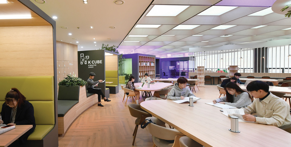 K-큐브는 ‘개방, 창의, 융합, 소통’을 컨셉으로 기존 독서실처럼 칸막이가 있는 정적이고 폐쇄적인 열람실 구조에서 탈피해 학생들이 함께 토론하고 교류하며 창의성을 높일 수 있도록 만든 협동 학습 공간이다. 카페와 휴게실, 회의실 형태, 팀플 세미나 룸과 도서관을 결합해 최근 기업체에서 주목받고 있는 공유오피스 위워크(We-Work)를 연상시킨다. 일종의 ‘조용한’ 열람실이 아니라 ‘떠드는’ 학습실인 셈이다.