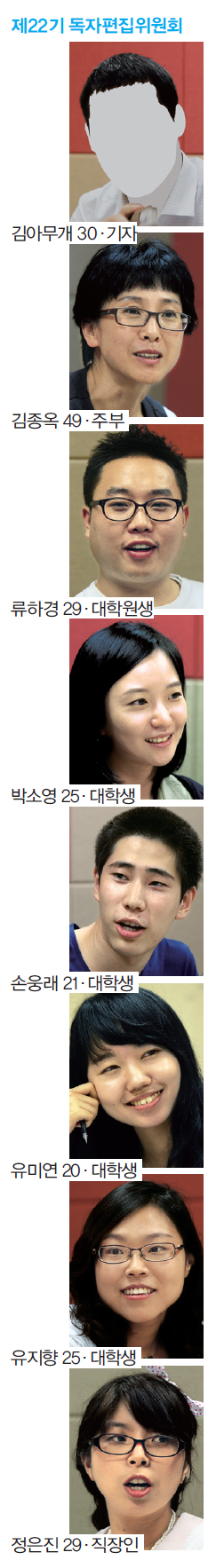 김정일 북한 국방위원장의 사망 소식으로 어수선했던 지난 12월19일 저녁, 22기 독자편집위원회 마지막 회의가 서울 마포구 공덕동 한겨레신문사 4층에서 열렸다. 안철수와 문재인을 표지로 다룬 884호부터 이명박 정부의 ‘토건내각’을 파헤친 889호까지 22기 독자편집위원들은 마지막 한 장까지 비판과 질정을 아끼지 않았다. 그 열정과 애정은 뒤풀이로 이어져 22기 독자편집위원들의 마지막 밤은 길고도 길었다.