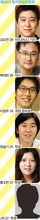 “다들 힐링 좀 되셨나? 대선 이후로.” 충청도에서 올라온 의사 백대현 독자편집위원이 1월22일 <한겨레21> 회의실에 들어서며 ‘힐링 덕담’을 건넸다. 선착순 1번 황소연 독편위원이 그저 웃는 가운데, 그가 “문재인 된다고 ‘5만원빵’ 했다가 여기저기 술 샀네”라고 말하며 앉았다. 기다리는 사이, 백 위원은 진도에도 없는 946호 표지이야기 ‘3살 벌써 학생’을 칭찬했고, 황 위원은 “X기자 팬이 진짜 많아요. 사람들을 막 홀린대요”라고 개편을 앞둔 ‘주객전도’를 칭송했다. 그렇게 대선을 중심에 두고, 938호부터 945호까지 평가할 <한겨레21>이 쌓여 있었다. 제24기 독자편집위원회 마지막 회의였다.