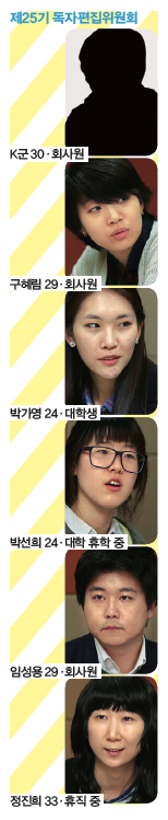 임 967호 일선 경찰의 고발문은 조직 내부에서 느끼는 현 상황에 대한 감정을 거침없이, 또 술술 읽히게 잘 쓴 듯하다. 경찰 지휘부 때 문에 잃었던 신뢰에 대한 희망을 다시 갖게 되는 글이었다. 정 주변 사람들은 마치 아무 일도 없는 것처럼 지낸다. 당연히 모 르지 않을 텐데. ‘나는 고발한다’가 시민이 더 많이 참여한다든가 해 서 적극적인 방식으로 발전해나갔으면 한다. 사장이 자기 지갑에서 1만원을 꺼내주다니 박 선 민주언론시민연합 신문 모니터링을 했는데, 기사 내용은 그 게 아닌데 제목은 다른 이야기를 하는 게 하루에 서너 면씩 있다. 북 방한계선(NLL) 기사가 실린 날은 6면을 다 털어서 왜곡됐더라. 전문 도 실었는데 <연합뉴스> <조선일보> <중앙일보>가 다르다. 전문마저 편집한 것이다. 968호 ‘언론사에 길이 남을 치고 빠지기’는 언론 문제 를 짚어줘서 고마웠다. 청와대 등 보수언론만 볼 것 같은 곳에 <한겨 레21> 보내주기 캠페인을 하면 좋겠다. (일동 웃음) 구 966호 특집으로 최저임금을 다뤘는데 그게 와닿지 않는다고 해야 되나, 그래서 왜 그럴까 생각해보니 아직 사용자의 입장에서 교 육을 받았던 프레임에 갇혀 있나 싶더라. 생계비 문제로 다가가보면 어떨까. 박 선 최저임금은 적어도 1만~2만원은 되어야 한다고 생각한다. 공부도 하고 여행도 하고 연애도 하면서 여유로운 애들이 있는데 과 외를 한두 탕 뛰는 애들이다. 과외비가 최저 시간당 1만5천원 정도 된다. 구 966호 홍기빈의 W 경제에 ‘화폐경제의 핵심이 배제’라는 말이 있다. 화폐경제에서는 인간의 가치가 좋은 대학, 좋은 회사, 내가 받 는 돈에 있다. 최저임금이 자존심의 값이기도 하다. 최저임금 5210원 을 받으면 자존심도 5210원이다. TV 오락 프로그램 <인간의 조건>에 서 개그맨이 2시간 일하고 난 뒤, 사장이 자기 지갑에서 1만원을 꺼 내 봉투에 넣지도 않고 주더라. 놀이공원 인형탈을 쓰고 일한 것에 대한 가치가 사장 개인 지갑의 1만원이라니. 돈을 다루는 것에 정신 적인 평가가 들어가 있다. 박 가 그래서 안 올려주는 것일까. 노동가치가 이만큼의 대우를 받 는 사람이다라는 생각이 들게 하니까, 부리기 쉽도록 싸게 매겨서. 돈이 아까워서라기보다는. 구 ‘동일노동 동일임금’에 동의하냐고 물으면 대학생들이 ‘동의하지 않는다’고 많이 대답한다더라. 969호 ‘2013 만인보’ 이응이씨 인터뷰 는 새로운 프레임으로 노동을 바라보게 한다. 박 선 그 글에 “월급명세서를 보면 짜증이 났어요”라고 나온다. 이응이씨처럼 깎이는 건 아닌데, 돈을 벌기 위해 알바를 하면 시간을 판다는 느낌이 든다. 노동을 판다는 기분이 아니라. 이런 기분이 강 해진다. 최저임금은 당연히 올라야 한다고 생각한다. 다만 왜 오르지 않는가에 대해 거꾸로 접근해보기도 한다. K 군 올라야 함에도 오르지 않는 데는, 오 르지 않아도 된다는 소극적 지지가 적지 않 기 때문인 것 같다. 큰 프랜차이즈보다는 동 네 편의점이 힘든 것처럼, 영세업자일수록 힘들 것 같다. 최저임금을 올렸을 때 생기는 이런 반대급부를 어떤 식으로 보완할지 고 민도 필요하다. 우리가 몰랐던 동네, 숨은 보물 찾기 구 965호는 핵패밀리 이야기인데 기시감 이 든다. 2011년 핵 관련 산업의 회전문 인사 가 다뤄졌는데 그때와 프레임도 비슷하다. 박 선 969호 하승수의 오, 녹색! ‘핵의 핵 대전’을 보고 깜짝 놀랐다. 도시에 살면서 전 기만 아껴쓰면 된다는 식으로 남들한테 위 험을 미루고 있었는데. 정 재작년 스마트그리드 하다가 상업성이 없어서 프로젝트가 없어졌다. 전기 위기는 심각하다지만 다른 방법으로 해결하지 않기 로 했나보다. 박 가 시도별 전력 수급을 보면 서울과 대 구는 다른 도시가 없으면 아예 살 수 없더라. 원자력발전소가 있는 작은 도시와 고압 전 송선이 예정된 경남 밀양 같은 데가 없으면 도시가 안 돌아가는 것이다. 그런 면에서 전 기 없이 하루를 보낸 968호 레드 기획을 재 밌게 읽었다. 정 968호 통계 뒤집기 ‘단전의 심리적 간극’을 보면 놀랍다. 놀이공 원처럼 전기를 많이 쓰는 곳이나 싸게 전기를 쓰는 대기업 공장부터 끊을 것 같은데 실제로는 주택·아파트가 먼저다. 박 가 ‘우리가 몰랐던 동네’ 시리즈 966호 마포와 970호 해방촌 편 을 보고 이사가고 싶었다. 주민들은 숨은 보물을 찾아서 터뜨린 거라 꺼리지 않을까 싶던데. 구 집이 부동산으로서 교환가치를 지닌 곳이 아니라 사는 곳, 관 계를 맺는 곳이라는 이야기를 보는 게 좋았다. 시리즈가 부정기적이 라는 게 더 떨린다. 언제 놓칠지 모르니. 사회·정리 구둘래 기자 anyone@hani.co.kr