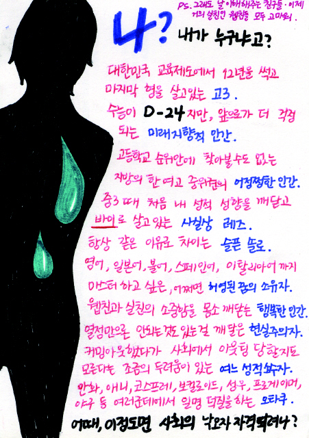 페이스북 0트위터 0공유네이버블로그카카오스토리카카오톡 공유하기스크랩프린트크게 작게[비밀엽서] 내가 누구냐고? 한국판 ‘비밀엽서 프로젝트’에 초대합니다 ◎ 엽서 보낼 주소 서울시 마포구 공덕동 116-25 한겨레신문사 4층 <한겨레21> ‘비밀엽서’ 담당자 앞 (우)121-750 한겨레와 함께 걸어주세요섬세하게 세상을 보고 용기있게 기사를 쓰겠습니다.후원하기후원제 소개좋은 언론을 향한 동행,한겨레를 후원해 주세요한겨레는 독자의 신뢰를 바탕으로 취재하고 보도합니다.후원하기후원제 소개당신의 가치를 후원으로 얹어주세요평화를 갈망하는 마음, 평등을 지향하는 마음,환경을 염려하는 마음...후원하기후원제 소개����한국판 ‘비밀엽서 프로젝트’[비밀엽서] 내 나이 19, 그의 나이 20[비밀엽서] 웃고 싶지 않아요[비밀엽서] 힘든걸요한겨레21 인기기사제 1587호20251031차례보기지난호보기낱권구입구독신청한겨레 인기기사