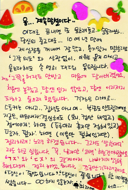 페이스북 0트위터 0공유네이버블로그카카오스토리카카오톡 공유하기스크랩프린트크게 작게[비밀엽서] ‘당신이 좋습니다’ 한국판 ‘비밀엽서 프로젝트’에 초대합니다 ◎ 엽서 보낼 주소 서울시 마포구 공덕동 116-25 한겨레신문사 4층 <한겨레21> ‘비밀엽서’ 담당자 앞 (우)121-750 한겨레와 함께 걸어주세요섬세하게 세상을 보고 용기있게 기사를 쓰겠습니다.후원하기후원제 소개좋은 언론을 향한 동행,한겨레를 후원해 주세요한겨레는 독자의 신뢰를 바탕으로 취재하고 보도합니다.후원하기후원제 소개당신의 가치를 후원으로 얹어주세요평화를 갈망하는 마음, 평등을 지향하는 마음,환경을 염려하는 마음...후원하기후원제 소개����한국판 ‘비밀엽서 프로젝트’[비밀엽서] 내 나이 19, 그의 나이 20[비밀엽서] 웃고 싶지 않아요[비밀엽서] 힘든걸요한겨레21 인기기사제 1587호20251031차례보기지난호보기낱권구입구독신청한겨레 인기기사