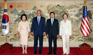 청와대에서 이명박 대통령 내외와 부시 대통령 내외가 기념 촬영을 하고 있다. 청와대사진기자단