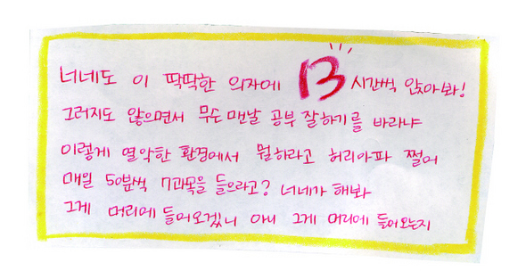 페이스북 0트위터 0공유네이버블로그카카오스토리카카오톡 공유하기스크랩프린트크게 작게[비밀엽서] 13시간씩 한국판 ‘비밀엽서 프로젝트’에 초대합니다 ◎ 엽서 보낼 주소 서울시 마포구 공덕동 116-25 한겨레신문사 4층 <한겨레21> ‘비밀엽서’ 담당자 앞 (우)121-750 한겨레와 함께 걸어주세요섬세하게 세상을 보고 용기있게 기사를 쓰겠습니다.후원하기후원제 소개좋은 언론을 향한 동행,한겨레를 후원해 주세요한겨레는 독자의 신뢰를 바탕으로 취재하고 보도합니다.후원하기후원제 소개당신의 가치를 후원으로 얹어주세요평화를 갈망하는 마음, 평등을 지향하는 마음,환경을 염려하는 마음...후원하기후원제 소개����한국판 ‘비밀엽서 프로젝트’[비밀엽서] 내 나이 19, 그의 나이 20[비밀엽서] 웃고 싶지 않아요[비밀엽서] 힘든걸요한겨레21 인기기사제 1587호20251031차례보기지난호보기낱권구입구독신청한겨레 인기기사