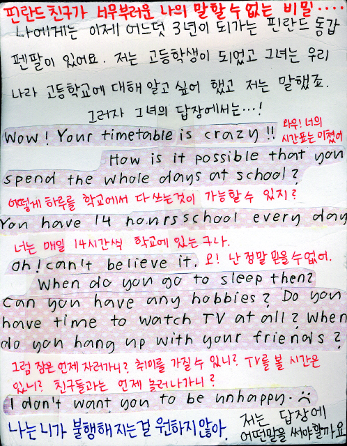 페이스북 0트위터 0공유네이버블로그카카오스토리카카오톡 공유하기스크랩프린트크게 작게[비밀엽서] 핀란드 친구가 너무 부러운… 한국판 ‘비밀엽서 프로젝트’에 초대합니다 ◎ 엽서 보낼 주소 서울시 마포구 공덕동 116-25 한겨레신문사 4층 <한겨레21> ‘비밀엽서’ 담당자 앞 (우)121-750 한겨레와 함께 걸어주세요섬세하게 세상을 보고 용기있게 기사를 쓰겠습니다.후원하기후원제 소개좋은 언론을 향한 동행,한겨레를 후원해 주세요한겨레는 독자의 신뢰를 바탕으로 취재하고 보도합니다.후원하기후원제 소개당신의 가치를 후원으로 얹어주세요평화를 갈망하는 마음, 평등을 지향하는 마음,환경을 염려하는 마음...후원하기후원제 소개����한국판 ‘비밀엽서 프로젝트’[비밀엽서] 내 나이 19, 그의 나이 20[비밀엽서] 웃고 싶지 않아요[비밀엽서] 힘든걸요한겨레21 인기기사제 1587호20251031차례보기지난호보기낱권구입구독신청한겨레 인기기사