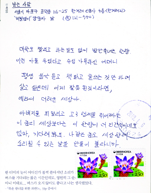 페이스북 0트위터 0공유네이버블로그카카오스토리카카오톡 공유하기스크랩프린트크게 작게[비밀엽서] 더러운 세상아 한국판 ‘비밀엽서 프로젝트’에 초대합니다 ◎ 엽서 보낼 주소 서울시 마포구 공덕동 116-25 한겨레신문사 4층 <한겨레21> ‘비밀엽서’ 담당자 앞 (우)121-750 한겨레와 함께 걸어주세요섬세하게 세상을 보고 용기있게 기사를 쓰겠습니다.후원하기후원제 소개좋은 언론을 향한 동행,한겨레를 후원해 주세요한겨레는 독자의 신뢰를 바탕으로 취재하고 보도합니다.후원하기후원제 소개당신의 가치를 후원으로 얹어주세요평화를 갈망하는 마음, 평등을 지향하는 마음,환경을 염려하는 마음...후원하기후원제 소개����한국판 ‘비밀엽서 프로젝트’[비밀엽서] 내 나이 19, 그의 나이 20[비밀엽서] 웃고 싶지 않아요[비밀엽서] 힘든걸요한겨레21 인기기사제 1587호20251031차례보기지난호보기낱권구입구독신청한겨레 인기기사
