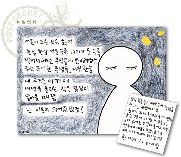 페이스북 0트위터 0공유네이버블로그카카오스토리카카오톡 공유하기스크랩프린트크게 작게[비밀엽서] 어른이 되는 것은 싫어 (※ 이미지를 클릭하면 크게 볼 수 있습니다)한국판 ‘비밀엽서 프로젝트’에 초대합니다 ◎ 엽서 보낼 주소 서울시 마포구 공덕동 116-25 한겨레신문사 4층 <한겨레21> ‘비밀엽서’ 담당자 앞 (우)121-750 한겨레와 함께 걸어주세요섬세하게 세상을 보고 용기있게 기사를 쓰겠습니다.후원하기후원제 소개좋은 언론을 향한 동행,한겨레를 후원해 주세요한겨레는 독자의 신뢰를 바탕으로 취재하고 보도합니다.후원하기후원제 소개당신의 가치를 후원으로 얹어주세요평화를 갈망하는 마음, 평등을 지향하는 마음,환경을 염려하는 마음...후원하기후원제 소개����한국판 ‘비밀엽서 프로젝트’[비밀엽서] 내 나이 19, 그의 나이 20[비밀엽서] 웃고 싶지 않아요[비밀엽서] 힘든걸요한겨레21 인기기사제 1587호20251031차례보기지난호보기낱권구입구독신청한겨레 인기기사