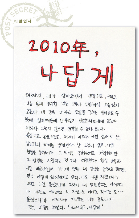 페이스북 0트위터 0공유네이버블로그카카오스토리카카오톡 공유하기스크랩프린트크게 작게[비밀엽서] 2010年, 나답게 한국판 ‘비밀엽서 프로젝트’에 초대합니다 ◎ 엽서 보낼 주소 서울시 마포구 공덕동 116-25 한겨레신문사 4층 <한겨레21> ‘비밀엽서’ 담당자 앞 (우)121-750 한겨레와 함께 걸어주세요섬세하게 세상을 보고 용기있게 기사를 쓰겠습니다.후원하기후원제 소개좋은 언론을 향한 동행,한겨레를 후원해 주세요한겨레는 독자의 신뢰를 바탕으로 취재하고 보도합니다.후원하기후원제 소개당신의 가치를 후원으로 얹어주세요평화를 갈망하는 마음, 평등을 지향하는 마음,환경을 염려하는 마음...후원하기후원제 소개����한국판 ‘비밀엽서 프로젝트’[비밀엽서] 내 나이 19, 그의 나이 20[비밀엽서] 웃고 싶지 않아요[비밀엽서] 힘든걸요한겨레21 인기기사제 1587호20251031차례보기지난호보기낱권구입구독신청한겨레 인기기사